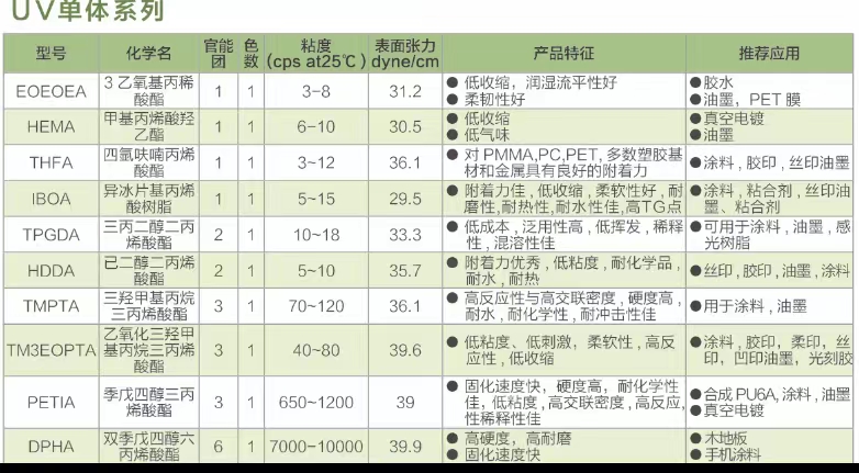 UV單體係列 EOEOEA .HEMA .THFA .ACMO .IOA .TM9EOPTA .PETIA .CTFA.TBCHA.DMAA